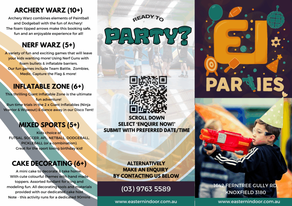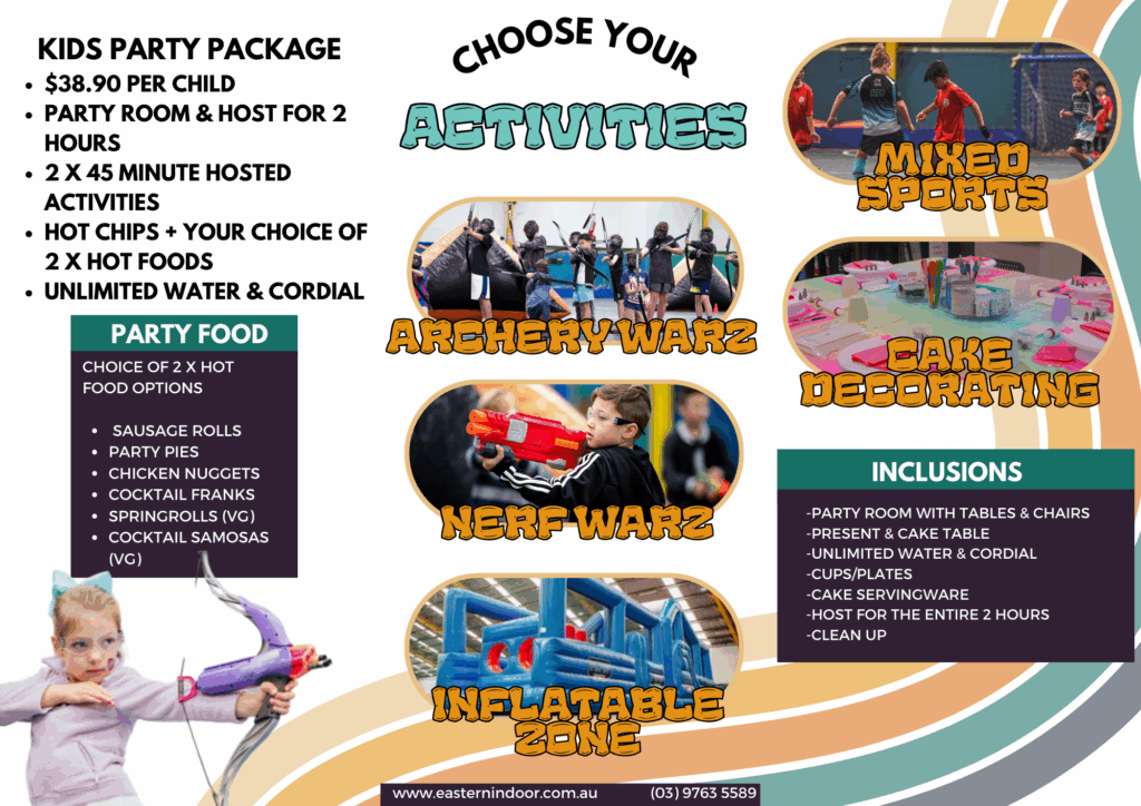 Eastern Indoor Specialise in kids birthdays for ages 6-14. We offer a range of different sports and activities that all kids enjoy.